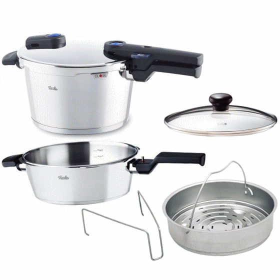 | ■ 一台何役もの幅広いレパートリー♪ 「煮る、炊く、蒸す、ゆでる」の他にも、解凍や瓶詰めなどの 保存食作りなど何役もの働きをこなす圧力鍋。 豊富なメニューがスピーディーに作れ、初心者の方にも心強いです! また、付属の蒸し器を利用すると、2段調理が可能! ■ 魚の骨まで柔らかく調理♪ スジ肉、スネ肉、魚の骨も短時間で柔らかく調理。 小魚の苦手なお子様やカルシウム不足が気になる方の 強い味方になります! ■ お手入れも簡単♪ すべてのフィスラー圧力鍋は、簡単に洗うことができます。 パッキンも取付け・取外しが簡単で、お手入れしやすく衛生的です。【セット内容】 ・ビタクイック 4.5L・スキレット 2.5L・ガラス蓋・蒸し器・三脚・レシピブック ・日本語説明書・保証書 【対応熱源】オール熱源対応(電磁調理器、ガスレンジ、IH、ハロゲンヒーター、200V対応) 【生産国】ドイツ(ガラス蓋:ベトナム) 【材質】本体:18-10ステンレス 底:アルミニウム合金+18-0ステンレス 【保証】10年メーカー保証(但し消耗部品は除きます) 【仕様】 ●ビタクイック 4.5L ・内径22×深さ13.1×本体高さ13.7×全高(蓋含む)17.7×長さ42.3(cm) ・重さ:3.0kg ・容量:4.5L ・底厚:5.8mm ●スキレット 2.5L ・内径22×深さ7.52×本体高さ8.1×長さ42.3(cm) ・重さ:2.0kg ・容量:2.5L ・底厚:5.8mm ●ガラス蓋 ・内径22cm ・強化ガラス ●蒸し器 ・ 関連キーワード: フィスラー 圧力鍋 おすすめ ティファール ワンダーシェフ 圧力鍋 パール金属 ブルーポイント ビタビット ノアール 6l 4l 3.5l 3l 2.5l 2l IH対応 電磁調理器 フライパン ガラスフタ フィスラー フタ 20cm 片手鍋 600-300-11-093 ビタクイック4.5 スキレット ・ビタクイック 4.5L・スキレット 2.5L・ガラス蓋・蒸し器・三脚・レシピブック・日本語説明書・保証書 母の日 結婚祝い 新築祝い プレゼント 父の日 敬老の日 プレゼント 9月19日 フィスラー ビタクイック圧力鍋4.5L&スキレット 特別セット(ガラス蓋・中かご・三脚・レシピブック付) カレー ご飯 炊飯 角煮 肉じゃが 4009209326191 フィスラー 圧力鍋 4.5 ビタクイック プラス フィスラー 圧力鍋 eigo プライパン 無水鍋 圧力なべ ティファール プライパン ステンレス鍋 圧力鍋 両手 圧力鍋 使いやすい ティファール 圧力鍋 圧力鍋 小型 パール金属 圧力鍋 圧力鍋 レシピ 象印 圧力鍋 業務用圧力鍋 ■商品説明の記載について・・各ページに記載されている商品説明はメーカーHPよりポイント部分を抜粋し記載させていただいております。 詳しくは必ずメーカーのHPで再度ご確認いただきご購入下さい。※当店の説明不足等の理由での返品はお断り申し上げます。